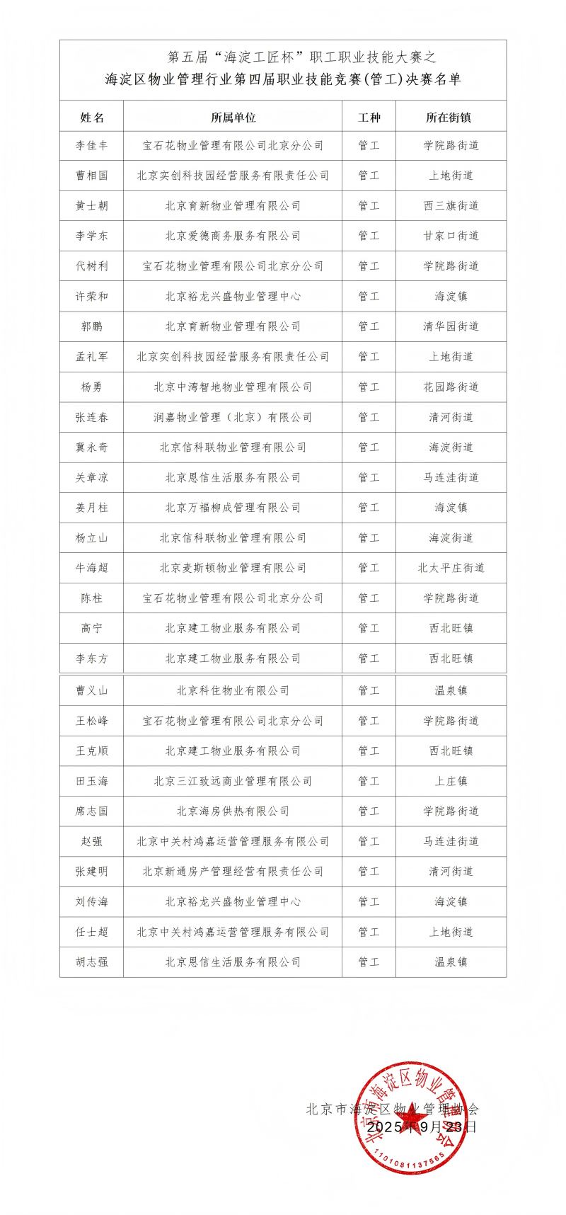2025年9月18日、21日,第五届“海淀工匠杯”职工职业技能大赛之海淀区物业管理行业第四届职业技能竞赛复赛顺利举办,物业管理师共计42人进入决赛、管工共计28人进入决赛。现将进入决赛的物业管理师及管工参赛人员名单公示如下: