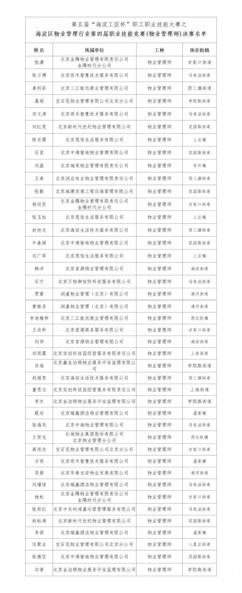 关于公示第五届“海淀工匠杯”职工职业技能大赛之海淀区物业管理行业第四届职业技能竞赛决赛入围名单