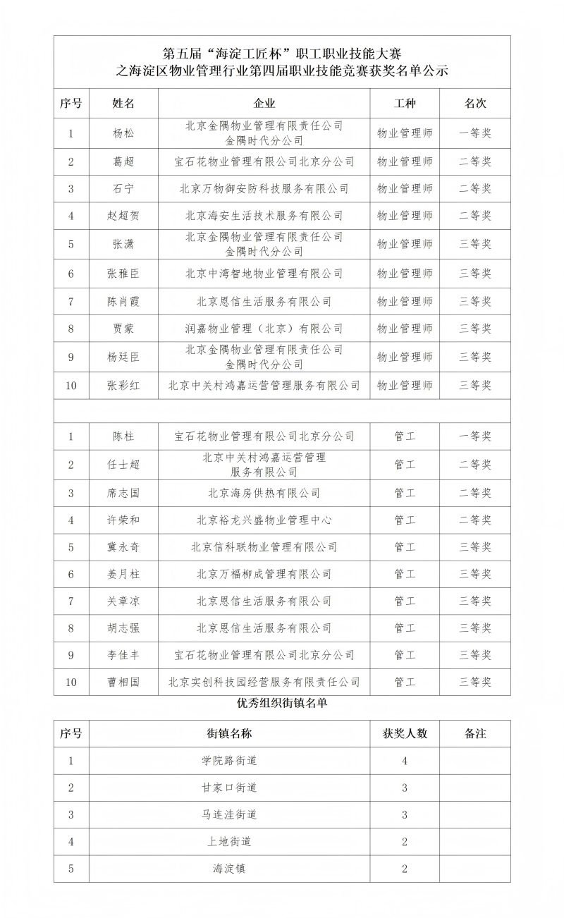 第五届“海淀工匠杯”职工职业技能大赛之海淀区物业管理行业第四届职业技能竞赛获奖名单